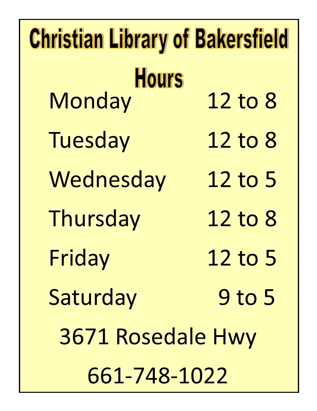 The Christian Library of Bakersfield is projected to open before the end of 2024. Hours will reflect the needs of our patrons.